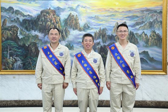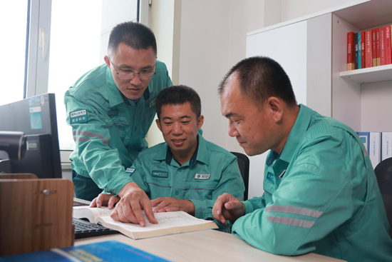 大国工匠王进(右)、冯新岩(中)和李敏(左)在商讨现场作业工器具改进方案