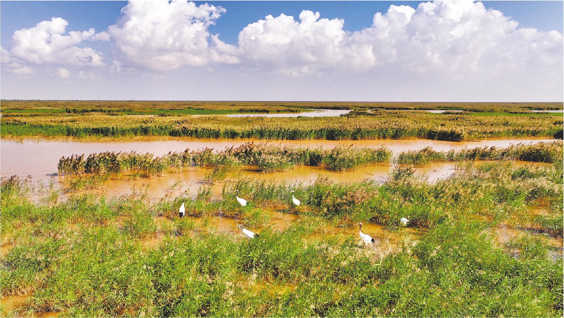 仲秋时节,黄河三角洲湿地芦苇随风摇曳。蓝天白云之下,广袤湿地一望无垠,东方白鹳、苍鹭等珍稀鸟类不时驻足觅食,与周边景致交相辉映,构成一幅和谐共生的生态画卷。