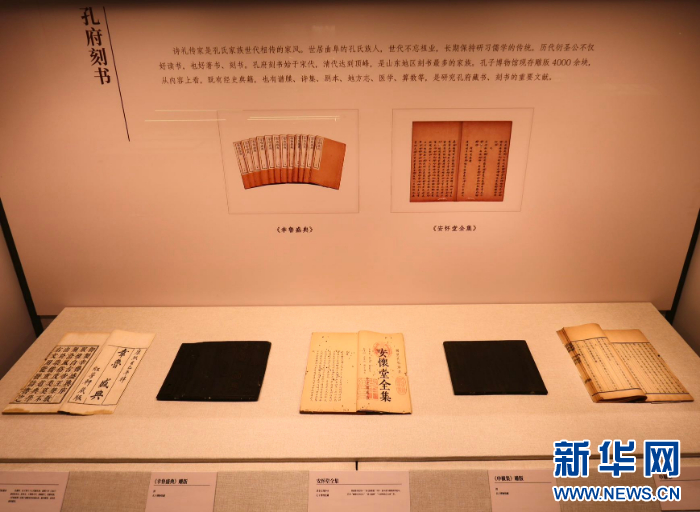 展出的清代红萼轩刻本《幸鲁盛典》、清奎文阁抄本《安怀堂全集》。新华网发(侯新建 摄)