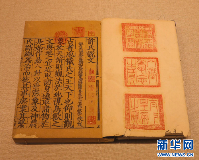 展出的宋刻元明递修本《重刊许氏说文解字五音韵谱》。新华网发(侯新建 摄)