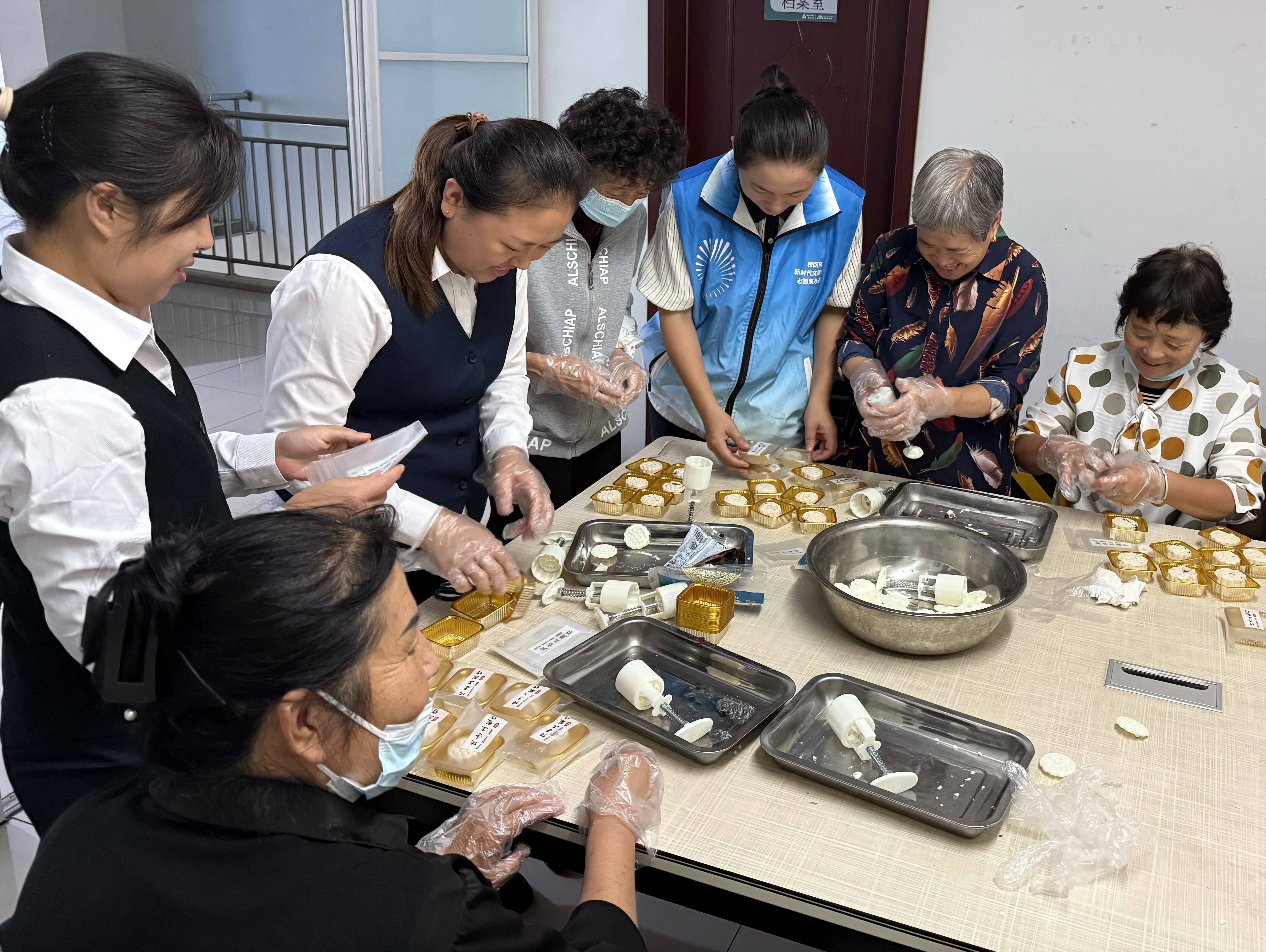 “要把面团揉得软硬适中,包馅的时候要慢慢转,这样月饼皮才均匀。”社区志愿者一边示范一边讲解,居民们学得有模有样,虽然手上沾了不少面粉,但脸上满是认真。不一会儿,一个个造型饱满、印着“中秋快乐”“花好月圆”吉祥字样的月饼就制作成型,放入烤箱后,活动室里很快飘满了黄油和桂花的香气。