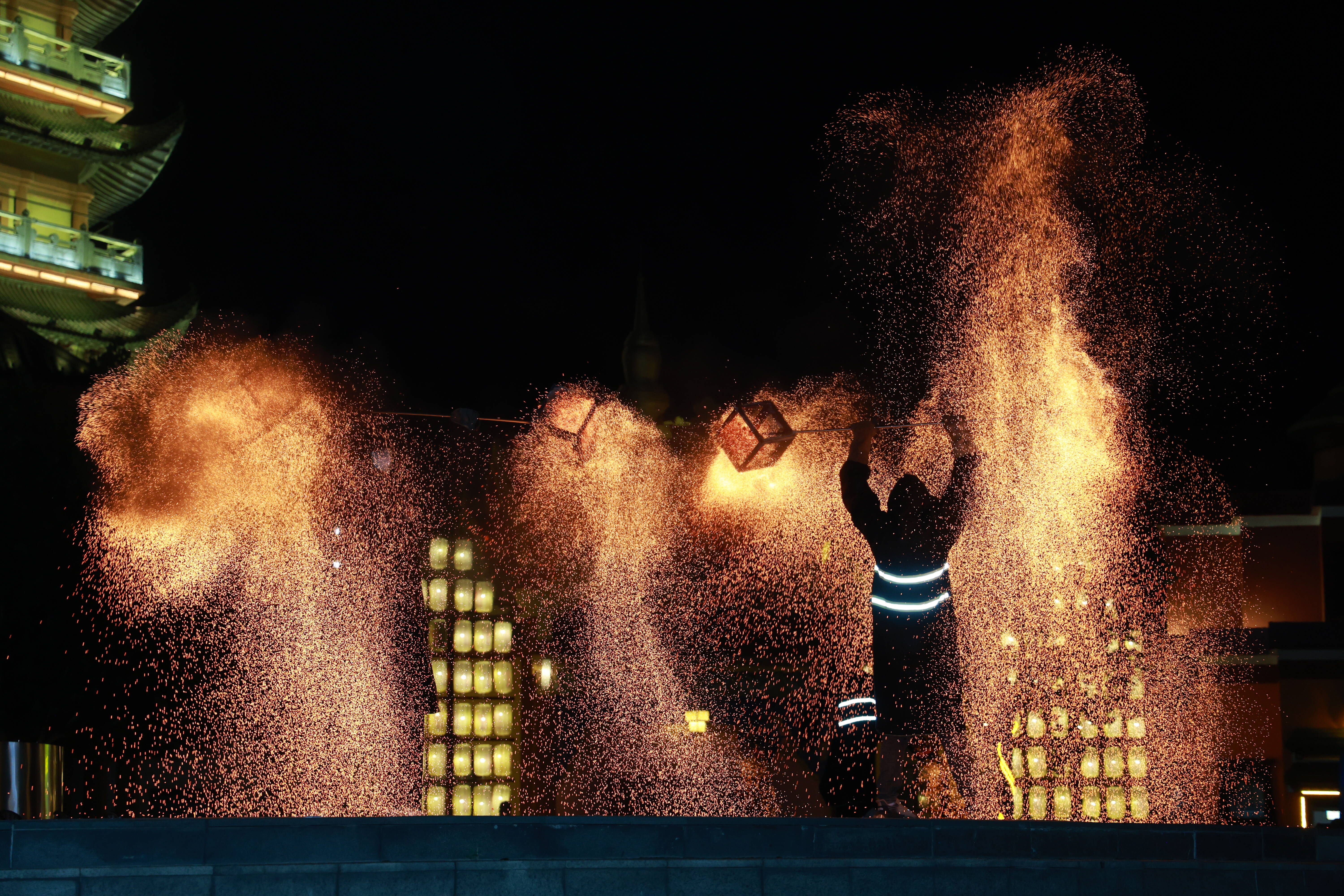 盛世欢歌大巡游、神画盛世宴、华彩非遗表演接连不断,变脸吐火、狮吼东方等精彩节目令游客目不暇接。而当夜幕降临,国家非物质文化遗产“火树银花秀”将气氛推向高潮——全新编排的“火龙、火刀、火壶”等绝技轮番呈现,铁花飞溅宛如星河倾泻,点亮了整个夜空。