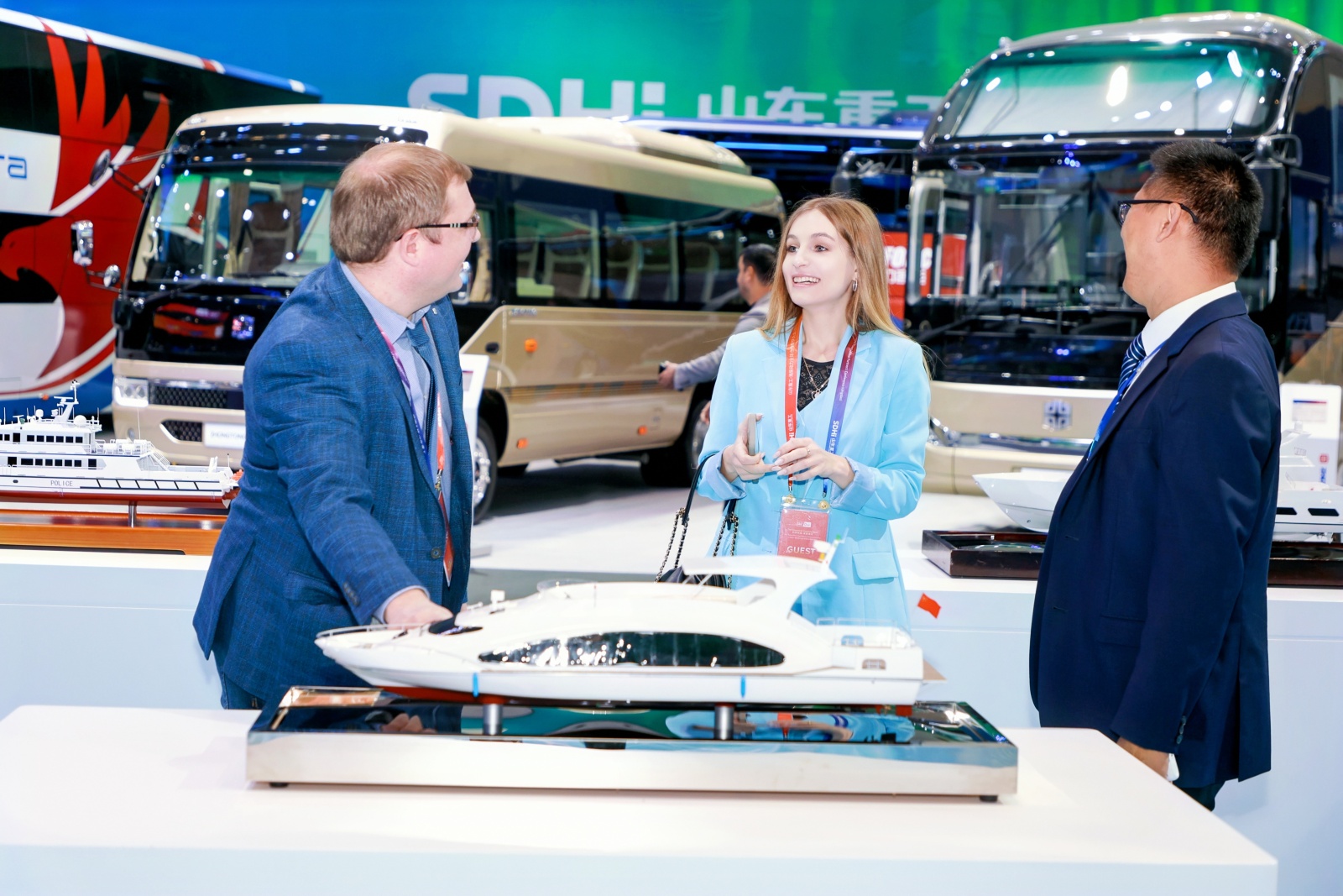 现场工作人员与两名外籍参观者进行交流。(主办方供图)