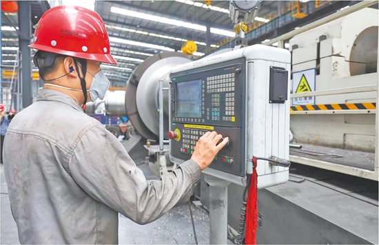 金雷科技股份公司生产车间内,技术人员操作控制面板,开展风电主轴生产作业。该公司是一家集风电主轴及大型铸锻件研、产、销于一体的国家火炬计划重点高新技术企业,接连实现了6MW超大异形孔锻造风电主轴、18MW超大铸造海上风电主轴等产品的首台套研制。(记者胡沥中 通讯员 曲泽辰 报道)