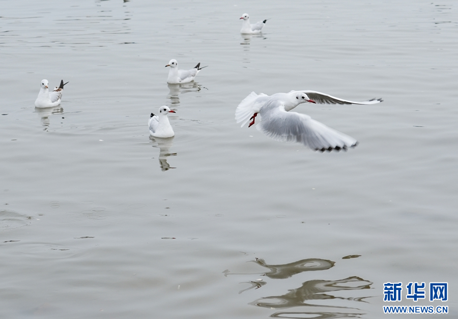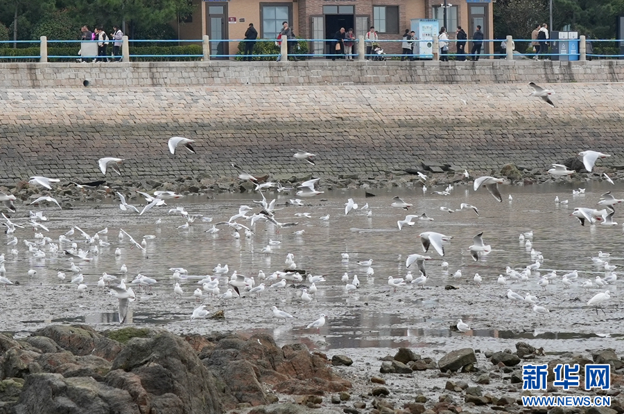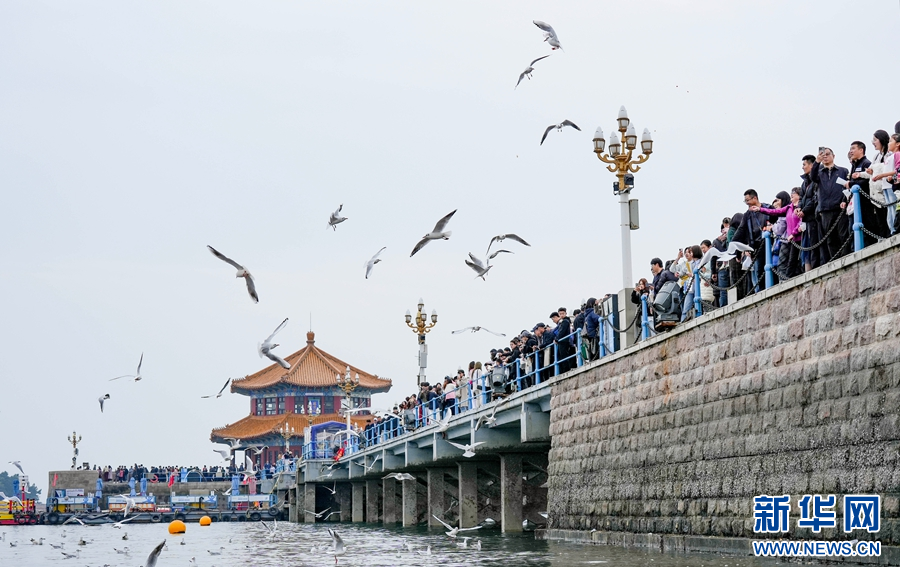 海鸥在栈桥景区海面上聚集。新华网发(杜春来 摄)