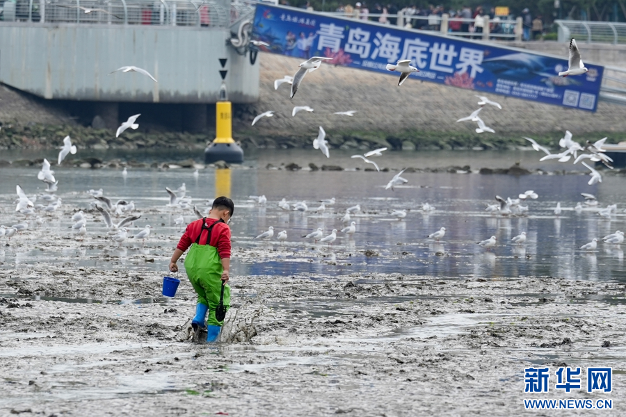 游客在栈桥景区赶海、看海鸥。新华网发(杜春来 摄)