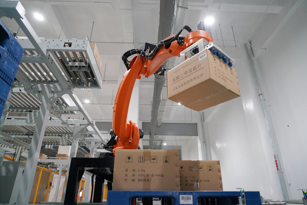 10月28日,在沂南力诺制药有限责任公司,全自动化机械臂在搬运货物。