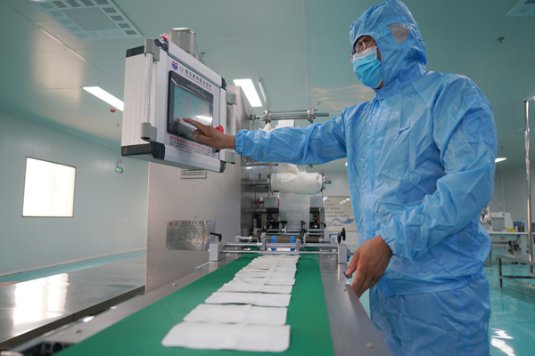 10月28日,在临沂康利医疗器械有限公司,工作人员在无菌敷贴生产线工作。