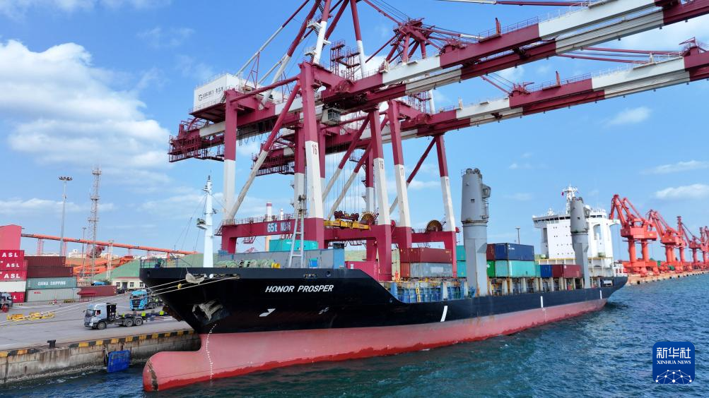 直达韩国仁川港的“泛奥升奥普轮”在青岛港前湾港区装卸集装箱(无人机照片,10月29日摄)。新华社记者 李紫恒 摄