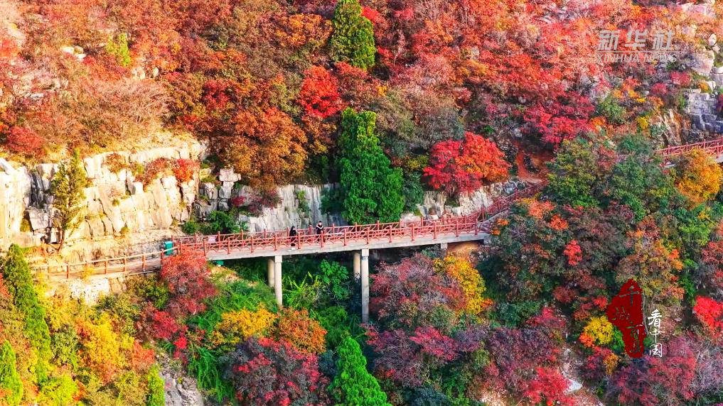深秋时节,山东省潍坊市临朐县石门坊景区漫山遍野的红叶进入最佳观赏期。峰峦之上、沟壑之间,层林尽染。沿着山路拾级而上,蜿蜒的小径穿梭于红叶与山林之间,一路美景令人陶醉。登顶远望,秋色愈发浓郁,红黄绿交相辉映,宛如一幅色彩斑斓的油画。山谷中,红叶渐次变红,与松树、灌木相互交织,在秋日阳光的照射下绘就一幅绚烂多彩的生态画卷。