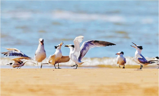 在日照刘家湾赶海园景区内,一群中华凤头燕鸥在觅食嬉戏。(记者 栗晟皓 通讯员 臧绍喜)