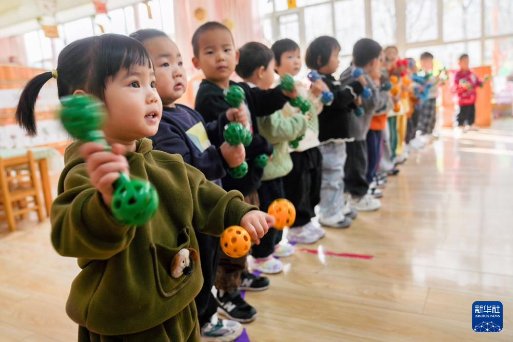 11月6日,在山东省邹平市黄山实验幼儿园,托育班的小朋友在做摇铃操。