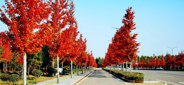 道路两旁枫树燃成红,层层叠叠的红,把秋日铺成了诗。刘玉平 摄