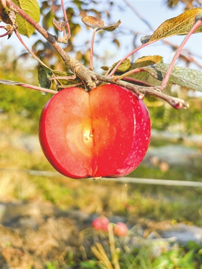 青岛农业大学园艺学院苹果育种团队负责人、“泰山学者”特聘专家、国家苹果产业技术体系岗位专家张玉刚介绍了“红丹”苹果的育种过程和品种特性。他表示:“‘红丹’苹果果肉鲜红,并且口感更脆更甜。”