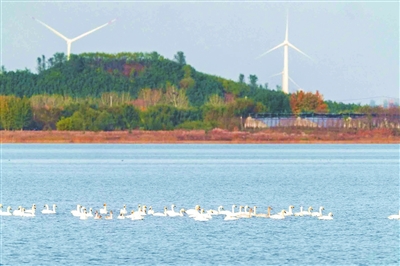 一群白天鹅在莱西湖上游弋。于考臣 摄