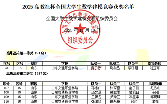 2025年“高教社杯”全国大学生数学建模竞赛成绩近日公布,山东交通职业学院参赛队在教师刘亚南、王刚等指导下载誉而归,获国家级一等奖1项、二等奖4项,创该校单届国奖数量新高,并延续了自2023年以来连续三年参赛队100%获奖的纪录,实现了赛事成绩数量与质量“双提升”。