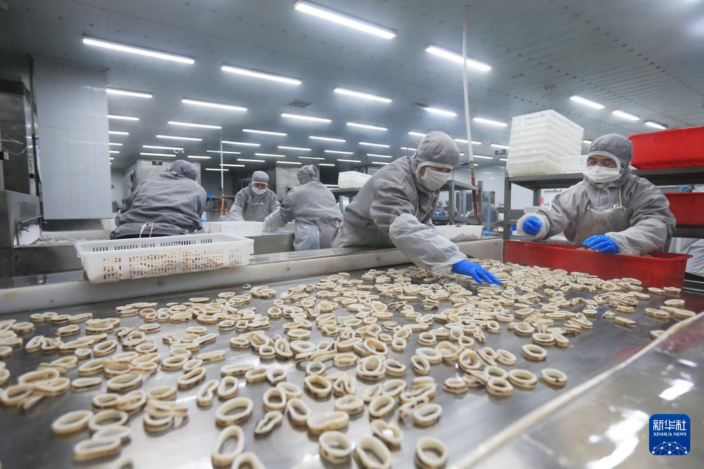 11月10日,山东省荣成市一家海洋食品加工企业的工人在加工鱿鱼产品。