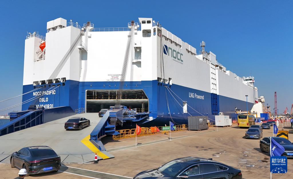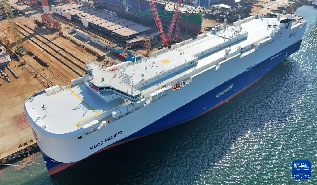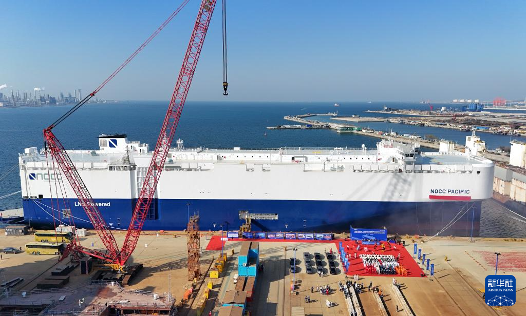 当日,由中集来福士为挪威建造的7000车位LNG双燃料汽车运输船“NOCC PACIFIC”号在山东省龙口市完工并举行命名仪式。该船针对新能源汽车运输安全做出了专门设计,可满足将于2026年1月1日起强制实施的《国际海运危险货物规则》第42-24修正案要求。新华社发(唐克摄)
