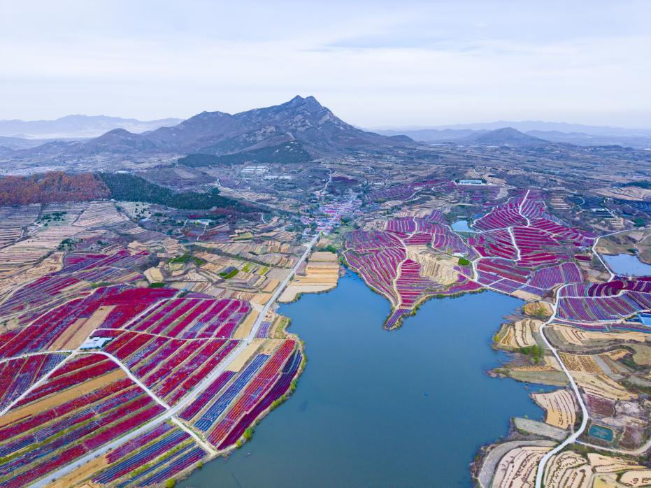初冬的日照山间,是一幅灵动的画卷。远山在云雾中若隐若现,宛如仙境。山间层林尽染,红橙黄绿斑斓交织;山脚湖畔,蓝莓田如大地调色盘,深浅绯红交织成海,如霞似火。田野、湖泊、远山绘就冬季独有的浪漫诗意。(刘晓楠)