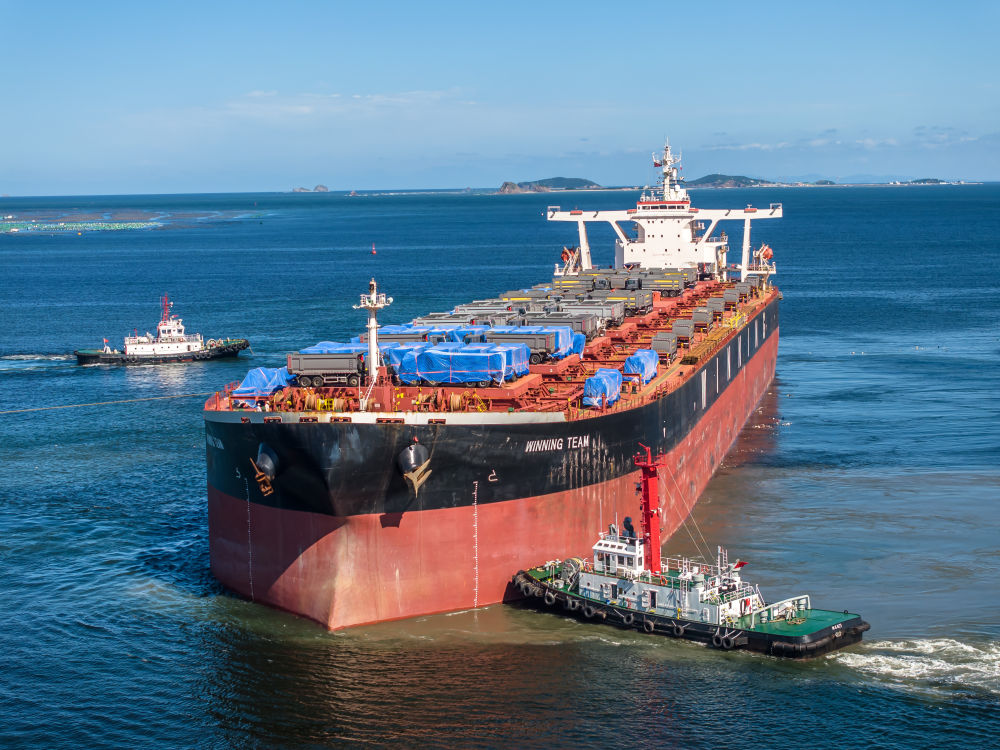 货轮从烟台港芝罘湾港区起航,开往非洲。(新华社)