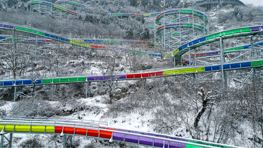 踏入景区大门,白雪覆满的中式门楼与远山相映,仿佛穿越进了水墨丹青的画卷里。蜿蜒的七彩滑道被白雪勾勒出灵动的线条,平日里的热闹与刺激,在雪的包裹下多了几分温柔;长颈鹿雕塑顶着蓬松的雪帽,成了雪地里俏皮的风景线。