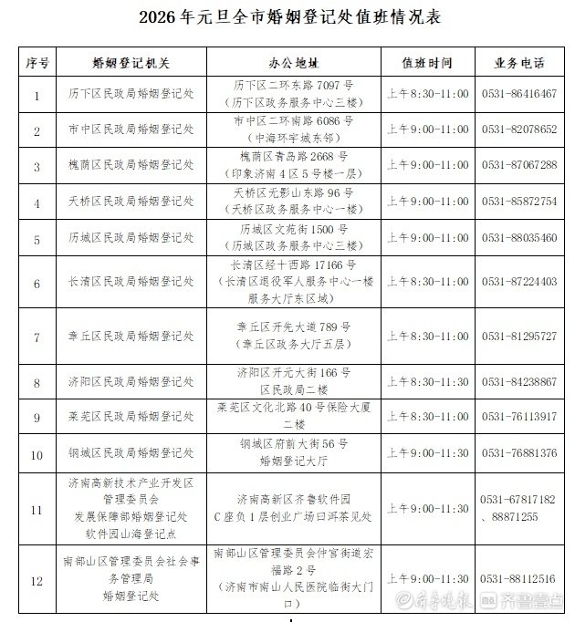 近日,记者从济南市民政局了解到,为进一步优化婚姻登记服务,满足群众多样化、个性化办事需求,不断提升便民服务质效,济南市12家婚姻登记处2026年元旦当天开展结婚预约登记服务。