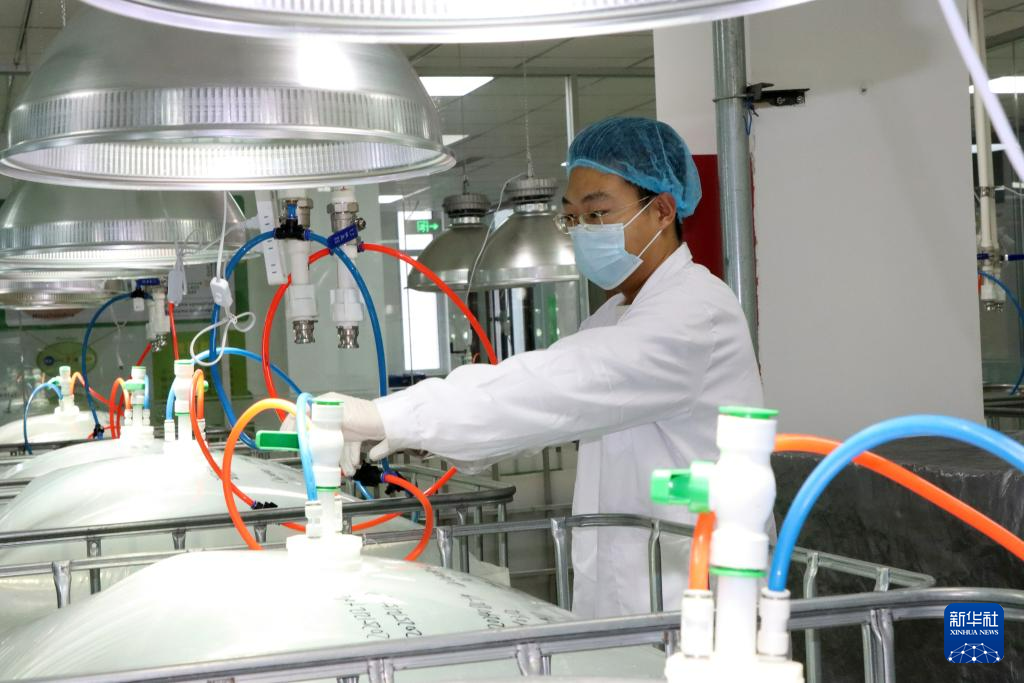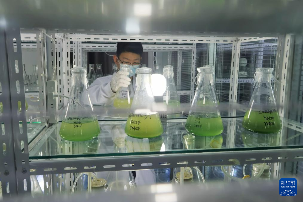 12月19日,在位于山东省乐陵市的德州地福来生物科技有限公司,科研人员在藻种培养室巡检设备。