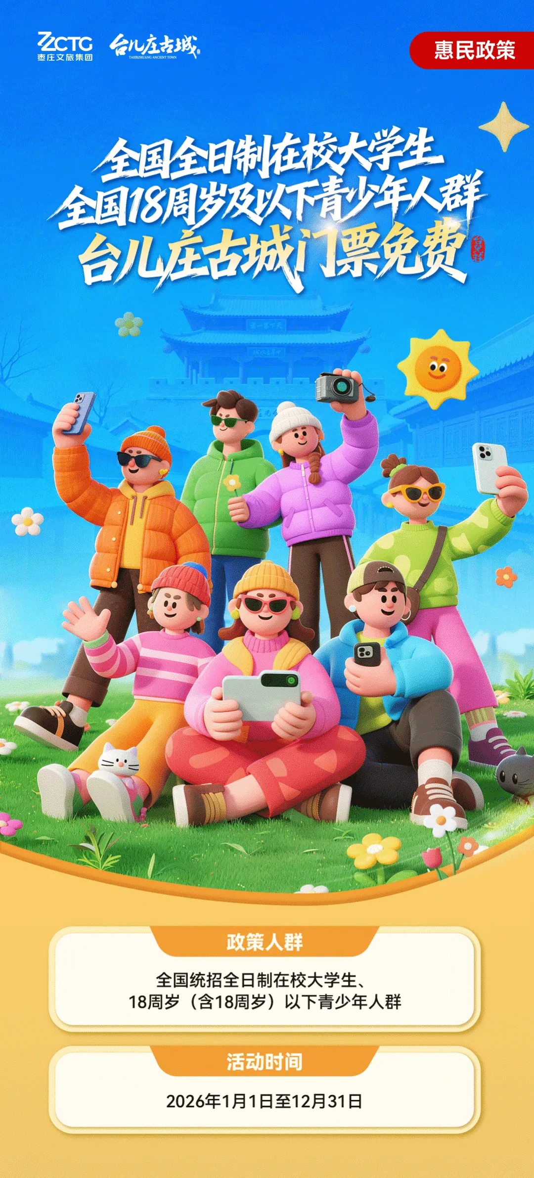 2026年1月1日至12月31日,台儿庄古城景区对全国18周岁(含18周岁)以下青少年人群及全国统招全日制在校大学生,实行门票免费的优惠政策。
