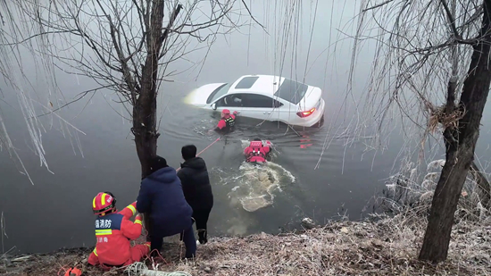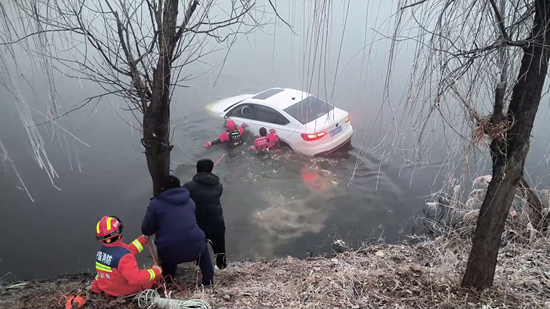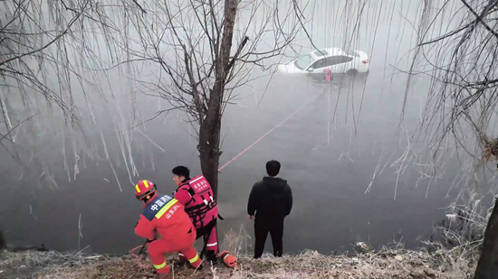 山东济南:浓雾中车辆坠河人员被困 消防员涉水救援-新华网