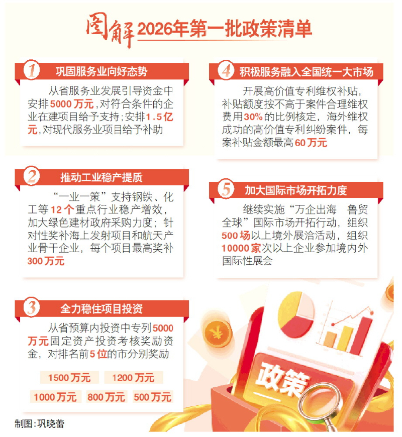 政策集成供给是近年来省委、省政府稳经济的创新举措、有力抓手。2025年山东省先后出台三批政策清单,为经济发展注入持续动力。在此基础上出台的2026年第一批政策清单,加力扩需求、优供给,做足增量上,精准发力增强服务业支撑作用、提速重点项目建设,培育新增长点;遏制减量上,突出支持稳住重点工业行业、建筑业;应对变量上,重点帮扶企业开拓海外市场,为全省经济持续回升向好提供有力支撑。