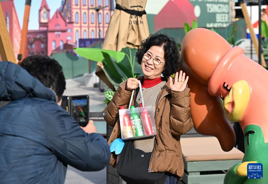 12月31日,韩国游客在青岛啤酒博物馆外留影。