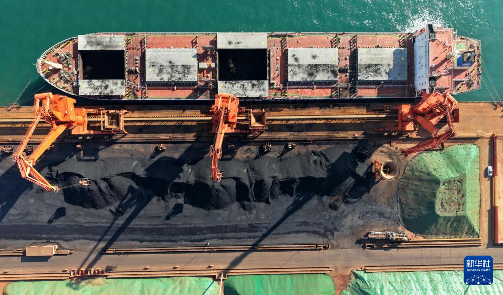 1月5日,在青岛港前湾港区86泊位,“鹏龙”轮在进行卸煤作业(无人机照片)。新华社记者 李紫恒 摄