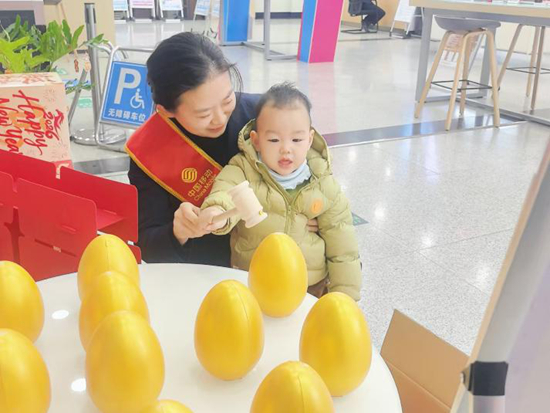 新年氛围拉满,多样活动暖人心。红金气球相映成趣,印着“2026”“新年快乐”的红色方块层层堆叠,明亮灯光让营业厅内的新年氛围愈发浓厚。厅内组织开展了“砸金蛋”活动,金蛋内置有雨伞、水杯、茶壶、向日葵摆件、小风扇等奖品,进厅客户纷纷参与,现场其乐融融。