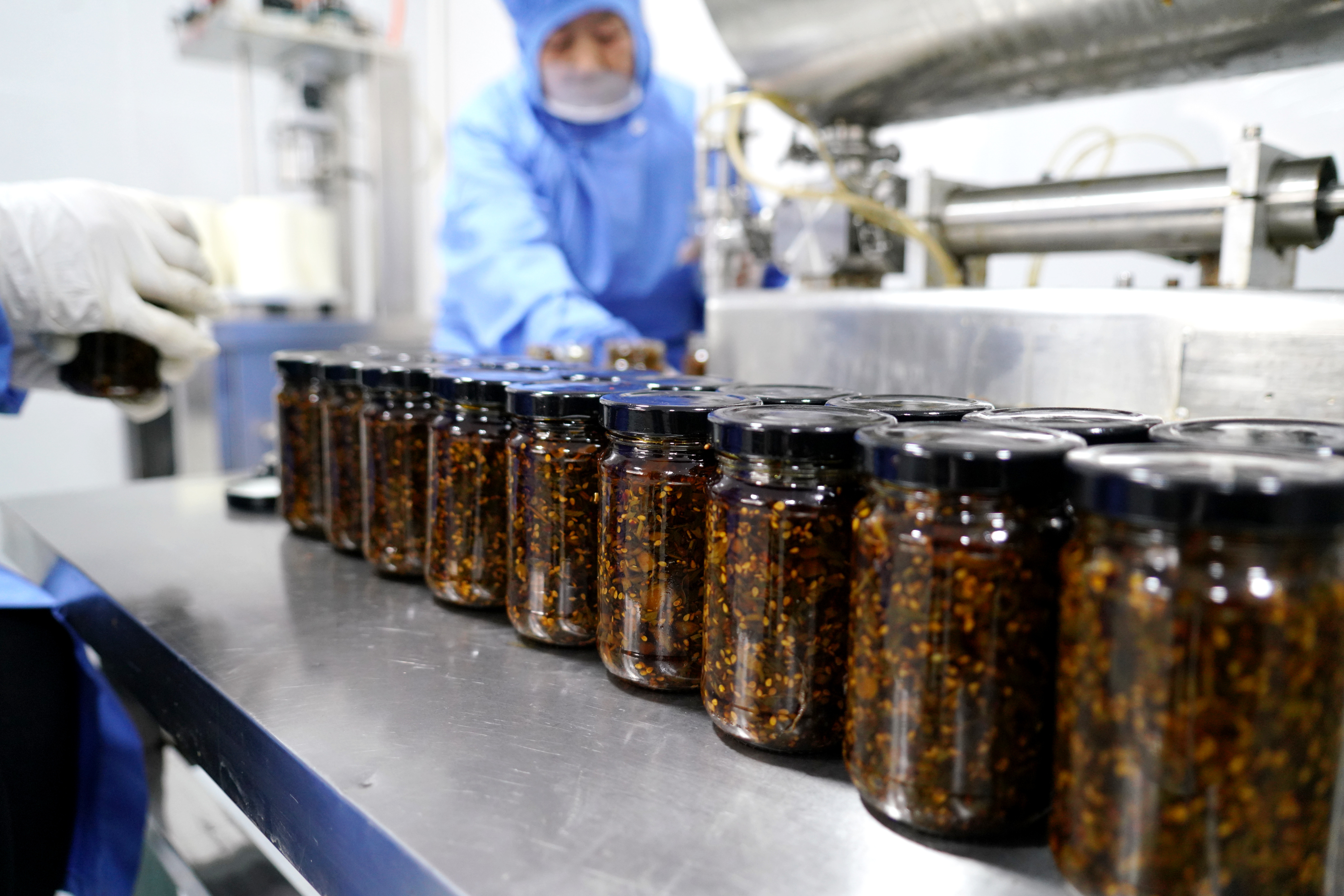 1月6日,在山东省沂南县岸堤镇泉水庄村“共富工坊”,村民将炒制的香椿酱进行包装。