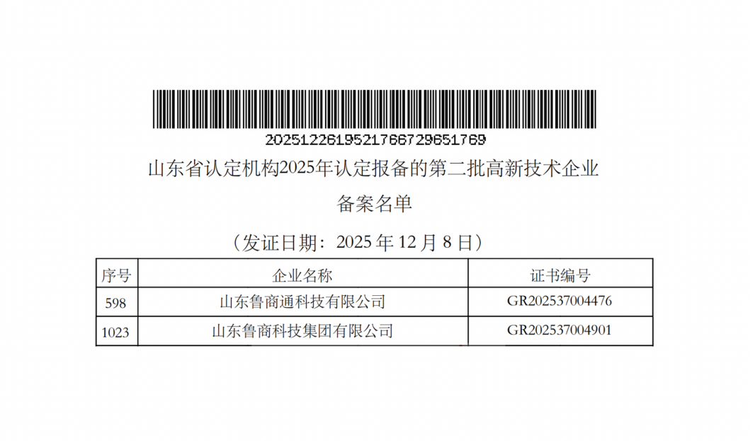 近日,2025年第二批高新技术企业认定予以公告,鲁商科技及子公司鲁商通双双入选。