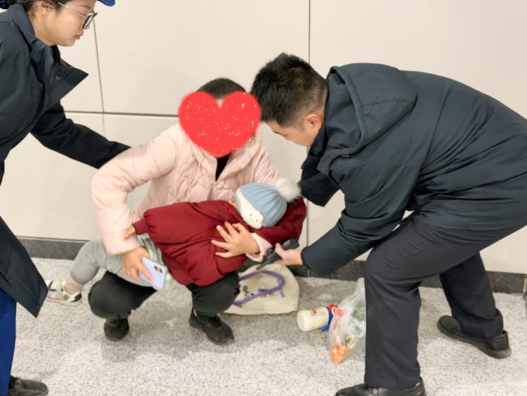 一位妈妈抱着熟睡的孩子坐在地上等待家人。巡视中的技术岗王朝阳轻声邀请:“站务室有热水,您快进来等吧。”