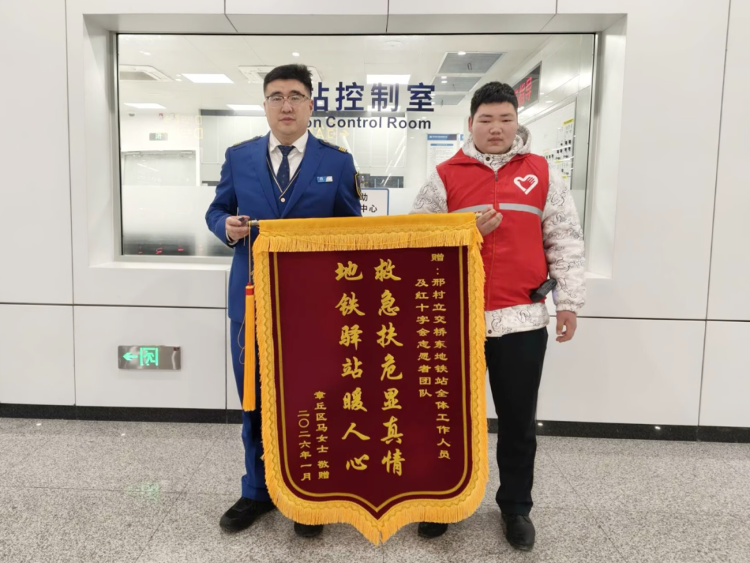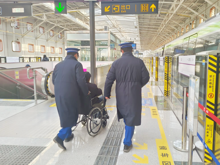 一位男性乘客突感不适、身体麻痹,值班站长姜志伟、申梦凡以及车站红十字志愿者迅速赶到展开救助,随后护送其出站送医。