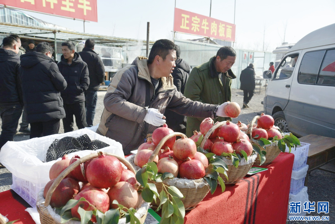 水果摊主将个大饱满的石榴摆放整齐。新华网发