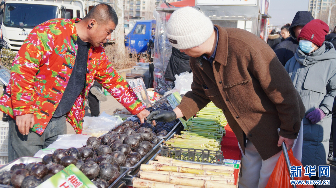 1月12日,在山东临沭曹洼大集,一名摊主正热心招呼顾客。新华网发