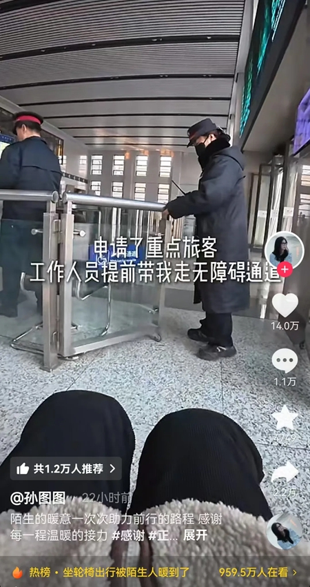 近日,网友@孙图图在抖音上发布了坐轮椅市民在乘坐济南地铁时,受到工作人员的精心照顾。视频里,工作人员不但将其送出地铁车站,还暖心地送到公交车上,途中还有市民不时上前热情帮忙。这条视频收获14万点赞,1万余条评论,近2万条转发。不少网友评论:“流着泪看完,一直想哭。”“真的是有温度的城市!”……