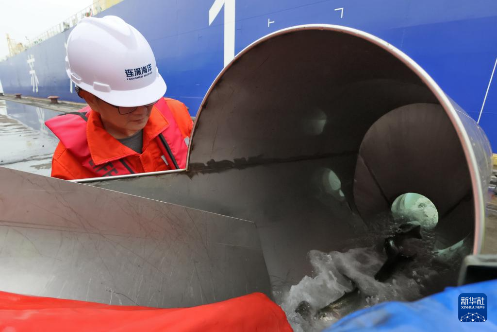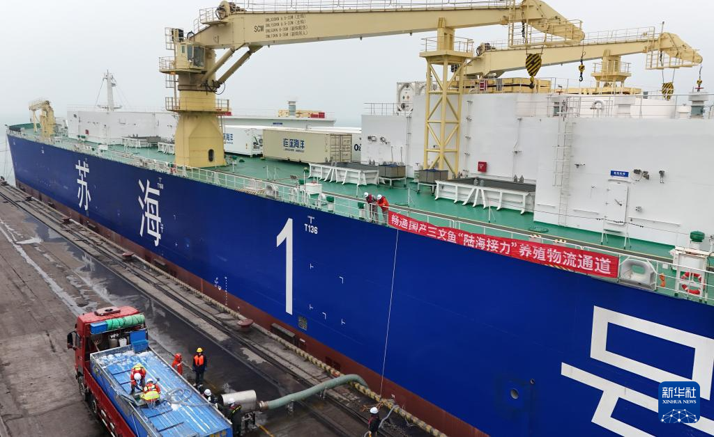 1月16日,16万尾由烟台本地企业培育的三文鱼鱼苗在山东港口烟台港装入10万吨级养殖工船“苏海1号”。随后该船将开赴适宜海域开展游弋式养殖。这是山东省港口集团首单三文鱼养殖工船装舱业务,标志着国产三文鱼“陆海接力”养殖物流通道进一步拓宽。新华社发(唐克摄)
