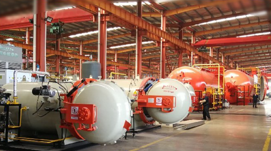 在山东中航泰达复合材料有限公司内,生产线正满负荷运转,机械臂精准完成罐体组装,工人们全力以赴赶制订单,顺利下线的热压罐在发货区整齐排列,车间内一派热火朝天的生产景象。