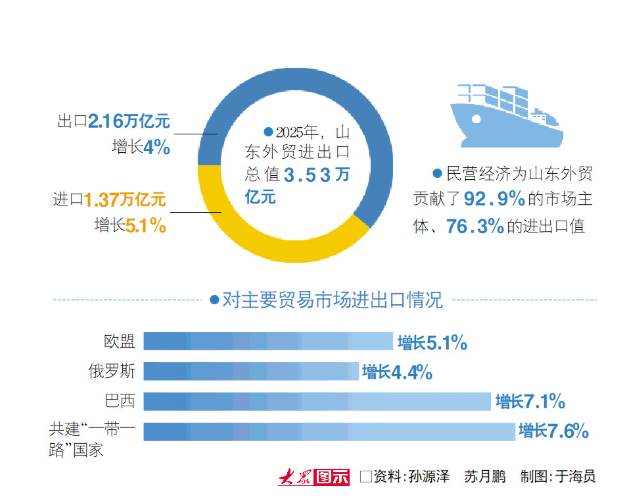 记者从今天(1月20日)上午省政府新闻办举行的新闻发布会上获悉,2025年山东省外贸进出口总值实现3.53万亿元,同比增长4.5%,规模再创历史新高,占全国进出口总值的7.8%,对全国外贸增长的贡献达到9.1%。其中,出口2.16万亿元,增长4%;进口1.37万亿元,增长5.1%。