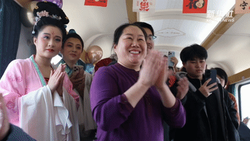 车厢里,国家级非遗沾化渔鼓戏现场开唱。旅客们都围拢过来,在回家的路上听了一段地道年戏。