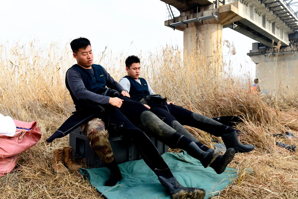 2月5日,在新(乡)兖(州)铁路梁济运河1号铁路特大桥,桥梁水下检测队的潜水员在穿潜水衣,准备下水作业。