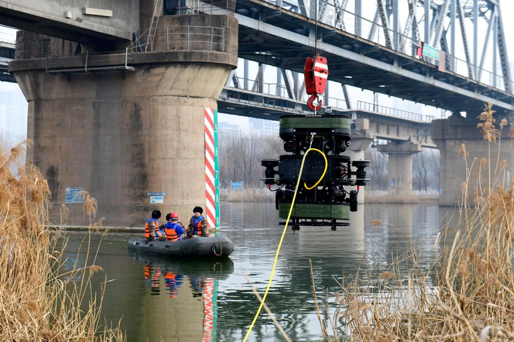 2月5日,在新(乡)兖(州)铁路梁济运河1号铁路特大桥,桥梁水下检测队的工作人员在吊运水下检测机器人。