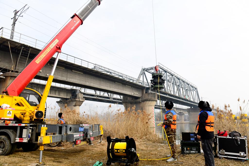 2月5日,在新(乡)兖(州)铁路梁济运河1号铁路特大桥,桥梁水下检测队工作人员将水下检测机器人吊运到指定水域。