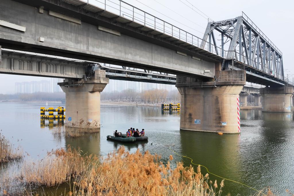 2月5日,在新(乡)兖(州)铁路梁济运河1号铁路特大桥,桥梁水下检测队工作人员开展桥墩水下检测作业。