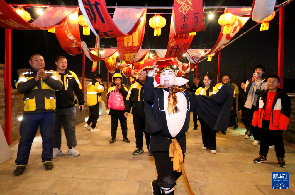 2月13日,新就业群体人员在山东省青岛市即墨古城观看民俗展演。