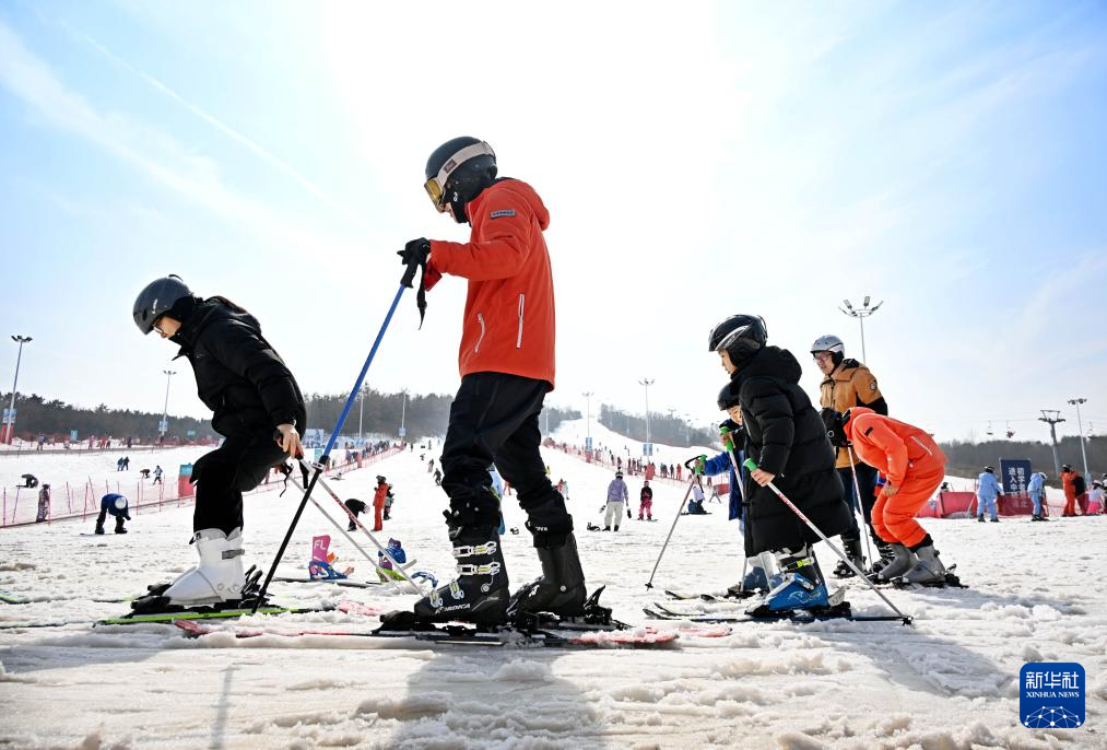 2月13日,游客在青岛西海岸新区融创藏马山滑雪场学习滑雪。新华社记者 李紫恒 摄
